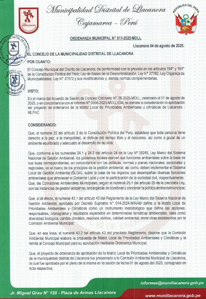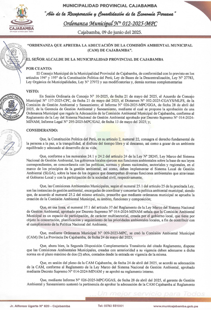 ORDENANZA MUNICIPAL QUE APRUEBA LA ADECUACIÓN DE LA COMISION AMBIENTAL MUNICIPAL (CAM) DEL DISTRITO DE SAN JOSE DE LOURDES DE LA PROVINCIA DE SAN IGNACIO
