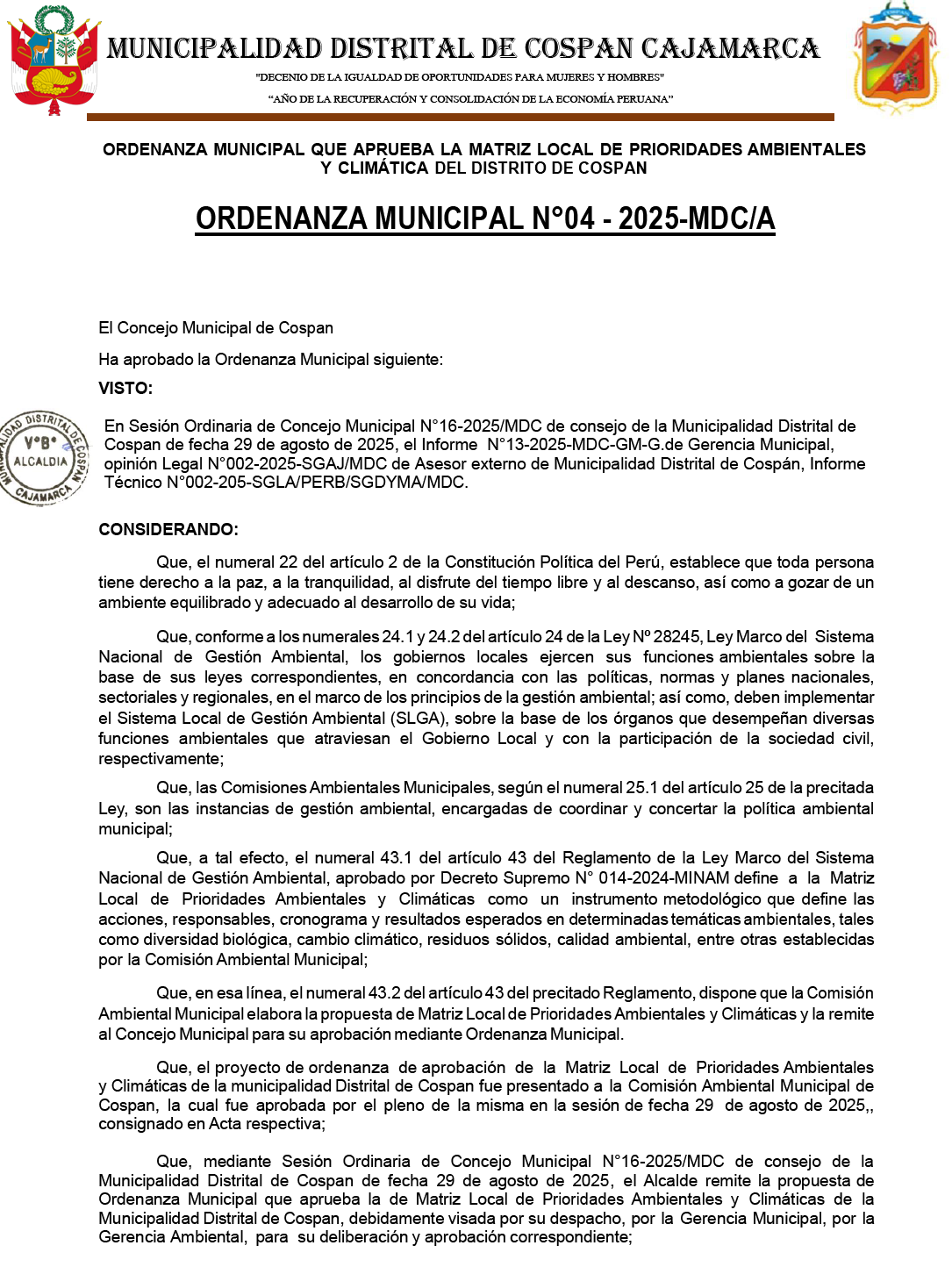 ORDENANZA MUNICIPAL QUE APRUEBA EL PROCESO DE IMPLEMENTACIÓN DEL SISTEMA REGIONAL DE GESTION AMBIENTAL DEL DISTRITO DE COSPAN -CAJAMARCA Y LA HOJA DE RUTA