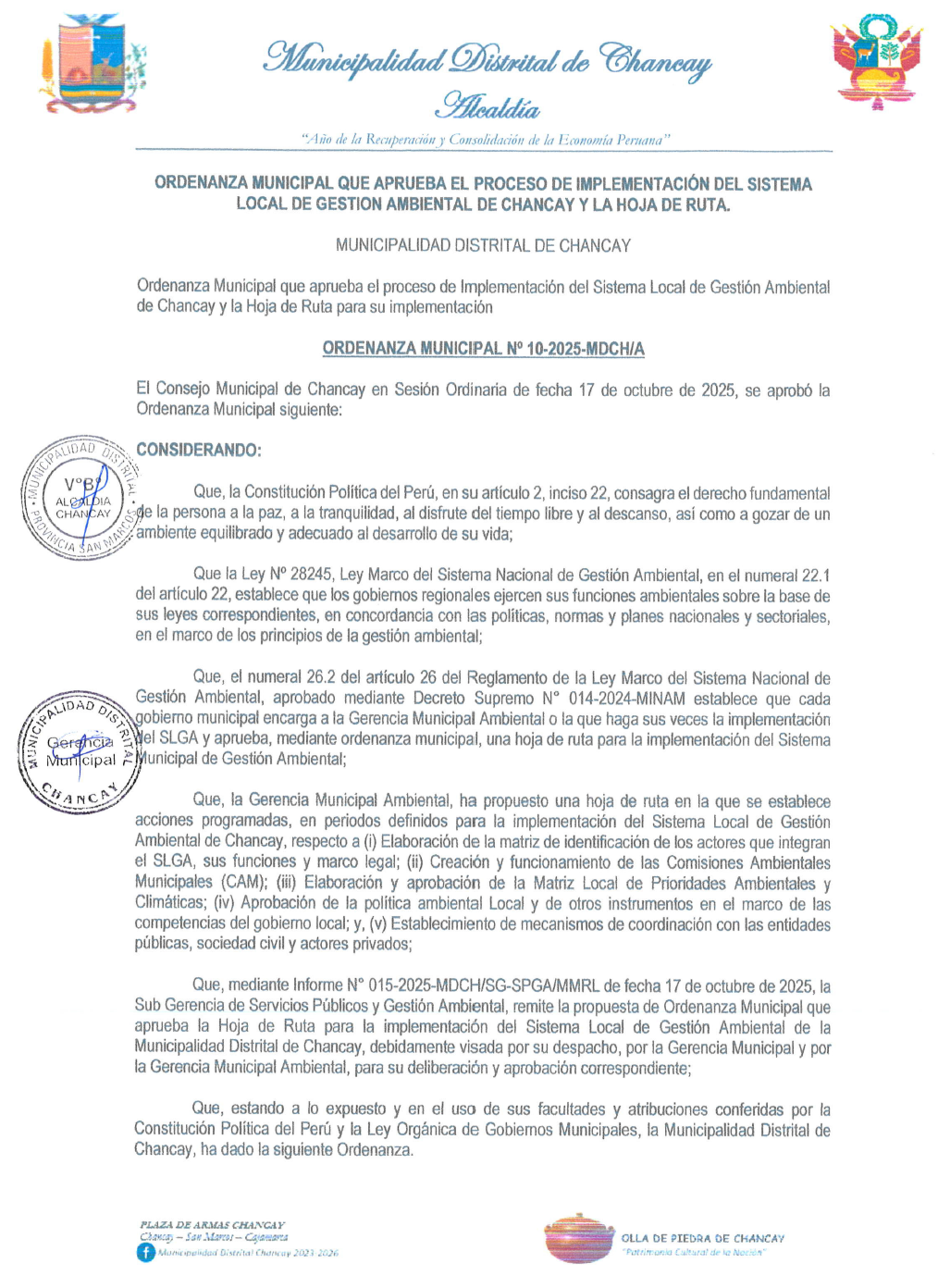ORDENANZA MUNICIPAL QUE APRUEBA EL PROCESO DE IMPLEMENTACIÓN DEL SISTEMA REGIONAL DE GESTION AMBIENTAL DEL DISTRITO DE CHACAY -SAN MARCOS Y LA HOJA DE RUTA